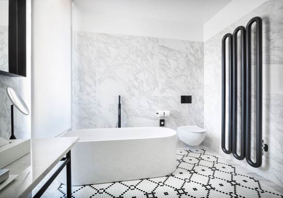 Marbre et mosaïque, carreaux de petit et grand formats, avec et sans relief… Si, au lieu de choisir un seul carrelage pour les murs et le sol de la salle de bains, on en choisissait plusieurs ? Si on osait mélanger les genres, les styles, les effets… ?