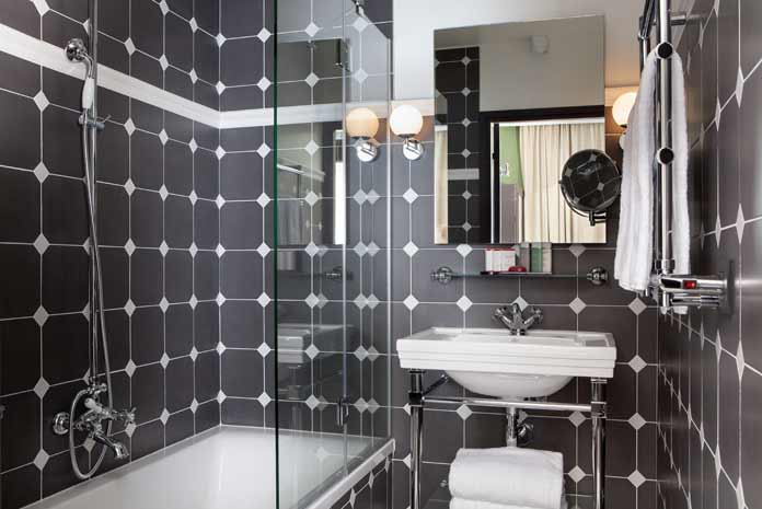 Blanc sur blanc : habiller le tablier et le pourtour de la baignoire à l’aide d’un carrelage ou autre revêtement blanc est la solution la plus simple, la plus efficace et la plus souvent utilisée pour faire disparaître la baignoire encastrée. Dans ce cas, le tablier et les murs doivent être recouverts du même carrelage, en particulier le plus grand mur. On peut utiliser un carrelage Métro ou une faïence blanche classique, de format carré, ainsi que, dans une version plus économique, l’un de ces panneaux d’habillage de la douche qui assurent à la fois la décoration et l’étanchéité des surfaces. Pour éviter l’aspect clinique du carrelage blanc – surtout lorsqu’il est brillant –, il est recommandé de réchauffer l’ambiance de la salle de bains avec des matières chaudes comme le bois, les tissus douillets… Ou bien de donner du style à la pièce, par exemple rétro ou encore graphique (noir et blanc)… Photo : Hôtel Monsieur Cadet (Paris 9e arrondissement).
