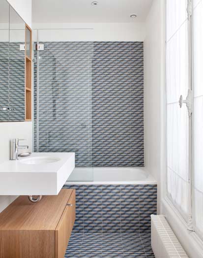 Pour parvenir à faire oublier la baignoire encastrée, il faut choisir un carrelage de caractère, dont les motifs sont très présents. Plus le carrelage a un pouvoir décoratif important et plus la surface couverte est grande, plus il nous enveloppe et attire notre regard. Les motifs géométriques sont particulièrement efficaces, qui font même vibrer la décoration, ajoutant un effet psychédélique. De même, un carrelage ou un revêtement uni – par exemple un de ces panneaux destinés à habiller les murs ou le tablier de la baignoire –, mais de couleur forte, est également efficace.
