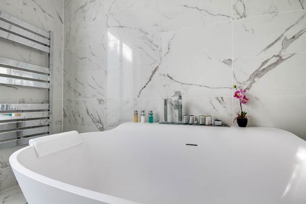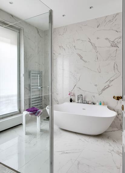 Cette salle de bains, réalisée par Cascade Design (Cascade-bain.com), est située dans un bel immeuble parisien. Très féminine, elle est habillée non pas de marbre mais de grès cérame grand format (30 x 60 et 60 x 60 cm). Ces carreaux aux bords rectifiés (très droits) acceptent une pose sans joint. L’ensemble est du plus bel effet, et beaucoup moins coûteux que le marbre (environ 90 €/m²).