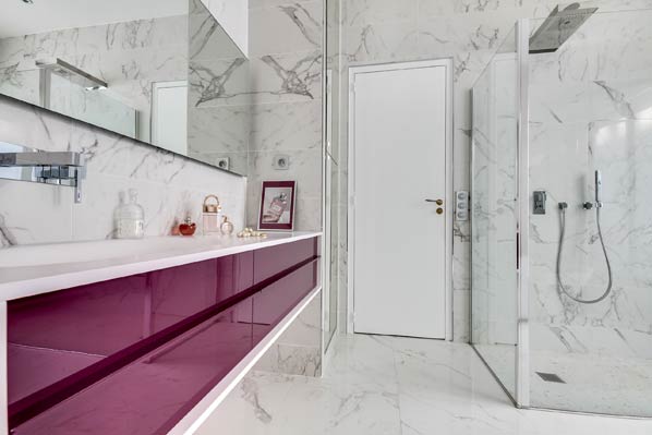 Toute de (faux) marbre vêtue, cette vaste salle de bains, réalisée par Cascade Design, est modernisée par le meuble-vasque aux façades laquées aubergine. Mais pas seulement…