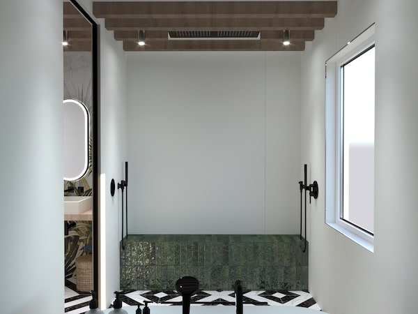 Une salle de bains en deux parties, comme des cocons verdoyants