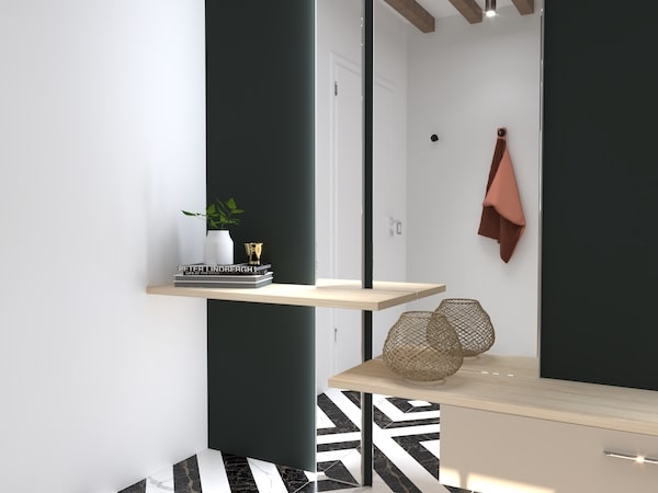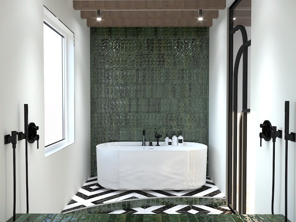 Le noir, qui trace des lignes graphiques, rythme les lieux. Celles de la verrière et des miroirs, de la robinetterie et des dalles de sol, qui composent des losanges en alternant marbre clair et marbre sombre. Aux murs, le vert, présent dans le panoramique en papier peint waterproof végétal (où il côtoie un bleu lumineux) et sur des carreaux unis façon zellige, crée une ambiance très intimiste. Un choix audacieux de revêtement, mais qui rend cette salle de bains unique !