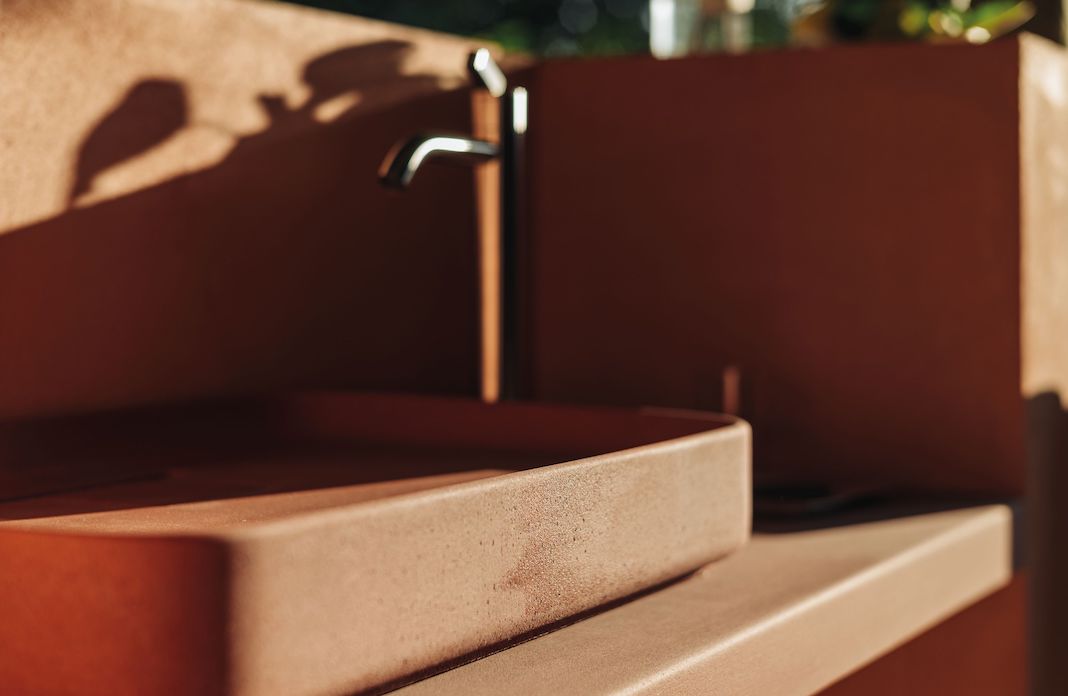 En raison de leur résistance élevée aux variations de température, les vasques en béton ou en ciment offrent en principe un autre avantage, celui de pouvoir être installées dehors (ou dans une pièce peu chauffée, comme une véranda par exemple). Chaque fabricant ayant sa recette, il convient dans ce cas de se référer à la notice technique pour s’assurer que le produit ne craint pas le gel et pourra ainsi s’accommoder, en toute saison, aussi bien d’une pose en intérieur qu’en extérieur (photo de droite : Bathco, vasque Pesquera, en mélange de ciment, résine et agrégats, collection Natural Series, Ø 40 x H 13 cm, trois coloris, 663 € HT).