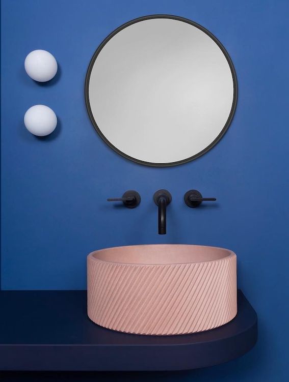 Kast, vasque Otto, collection Kanvas, en béton strié, Ø37,5 x H16 cm, 28 coloris, dont rose blush. A partir de 1 853 € HT). Chez Sopha Industries.